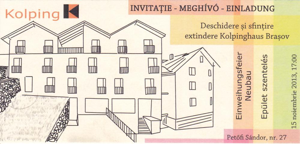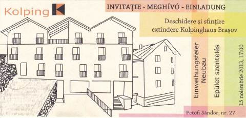 Das Kolping-Hotel in Brasov/Rumänien, wo wir während unserer Vereinsreise 2007 logierten, wird momentan erweitert. Es entstehen zusätzliche Zimmer, ein Mehrzwecksaal sowie gedeckte Parkplätze. Ausserdem wird der Garten komplett umgestaltet. Am 15. November 2013 wird der Neubau im Beisein von Generalpräses Msgr. Ottmar Dillenburg offiziell eingeweiht. Zu dieser Einweihungsfeier hat Kolping Rumänien auch die Mitglieder der KF Hochdorf eingeladen! Wer der Einladung gerne Folge leisten und nach Siebenbürgen reisen möchte, erfährt Genaueres bei Daniel Unternährer (Tel. 041 670 38 17 oder per E-Mail).