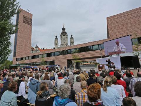 Die Kolpingsfamilie Leipzig-Propstei, bei welcher wir anlässlich unserer Vereinsreise 2013 zu Besuch waren, hat ein neues Zuhause: am Sonntag, 9. Mai wurde in Leipzig die neue Propsteikirche St. Trinitatis geweiht. Auf unserem Stadtrundgang hatten wir 2013 auch die Baustelle dieser neuen Kirche besucht.