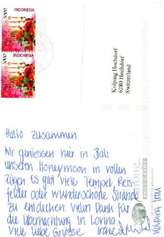 Auch im Zeitalter von SMS und Internet-Gästebuch erreicht uns noch ab und zu eine Ansichtskarte! Irene und Michael Kretz-Gassmann verbringen ihre Flitterwochen in Bali und von dort grüssen sie die ganze KF Hochdorf.