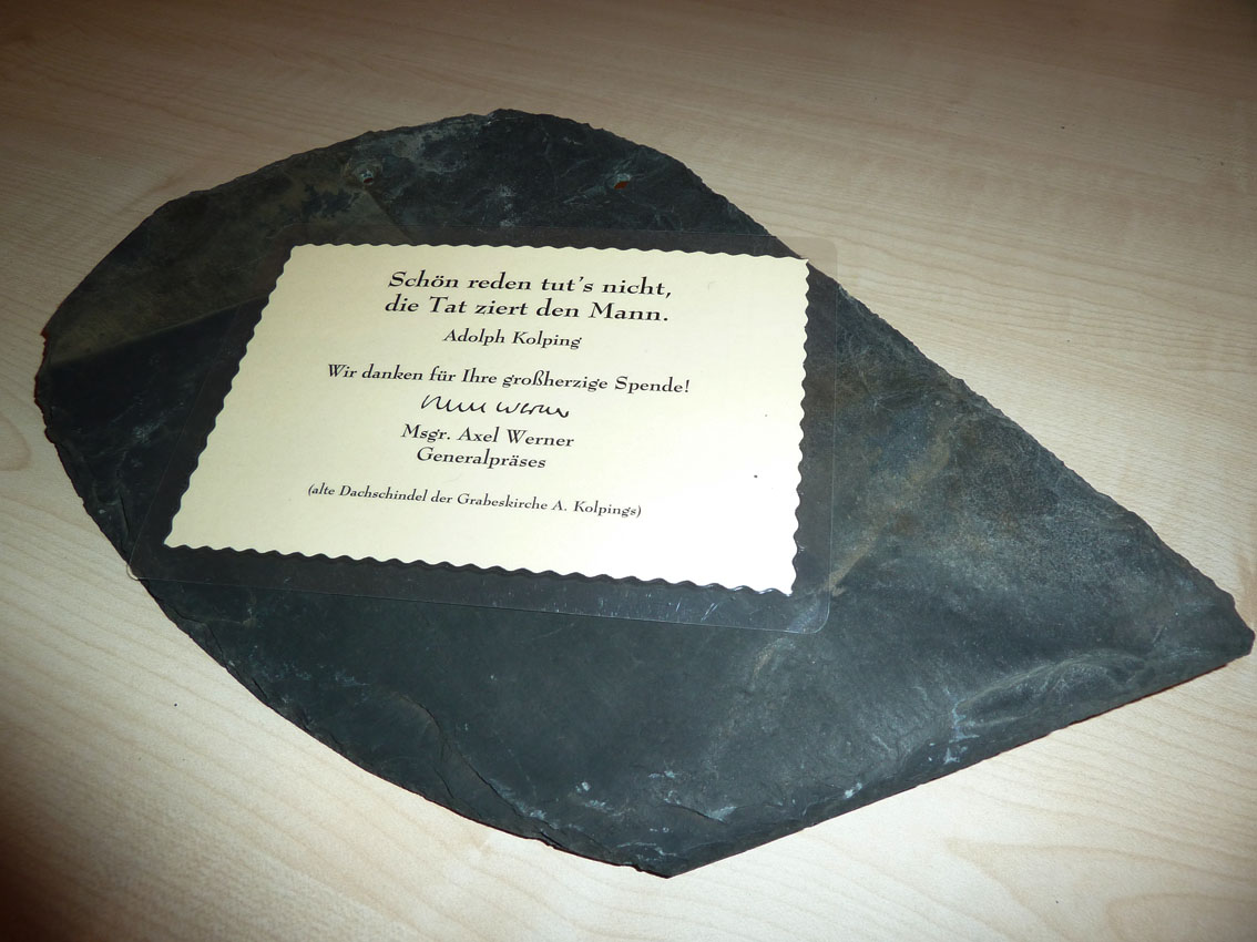 Anlässlich unseres Klausurtages im November überreichte uns Bernhard Burger einen Brief von Generalpräses Msgr. Axel Werner sowie eine alte Dachschindel der Minoritenkirche als Dankeschön und Anerkennung.