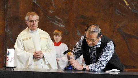Anlässlich der Entweihung durfte Kolpingmitglied Werner Unverricht die Reliquien aus dem alten Altar entfernen. Sie wurden in der neu geweihten Propsteikirche wieder eingesetzt.